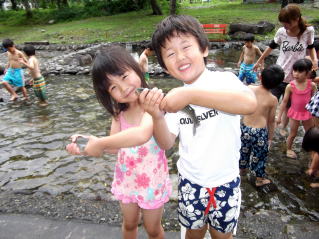※夏の越後湯沢お泊まり保育。マス掴みの一コマ。